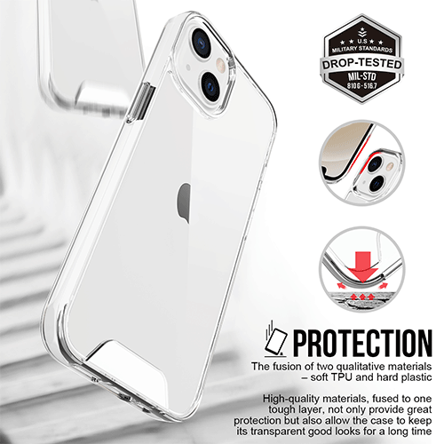Bërë nga një përzierje e polikarbonatit optikisht të pastër dhe materialeve fleksibël TPU. Kutia transparente e telefonit kundër rënies ofron një ndjesi të fortë dhe komode. Pjesa e pasme është projektuar për të qenë e fortë, ndërsa anët janë bërë nga një material më i butë, më fleksibël që përshtatet pikërisht mbi butona për një kontroll të përmirësuar. Në sipërfaqe, një shtresë rezistente ndaj gërvishtjeve është aplikuar si në pjesën e brendshme ashtu edhe në atë të jashtme. Dhe të gjitha materialet dhe veshjet janë të optimizuara për të parandaluar zverdhjen me kalimin e kohës. Si çdo rast i projektuar nga Apple, ai i nënshtrohet mijëra orëve testimi gjatë gjithë procesit të projektimit dhe prodhimit. Pra, jo vetëm që duket i shkëlqyeshëm, por është ndërtuar për të mbrojtur iPhone tuaj nga gërvishtjet dhe rëniet.